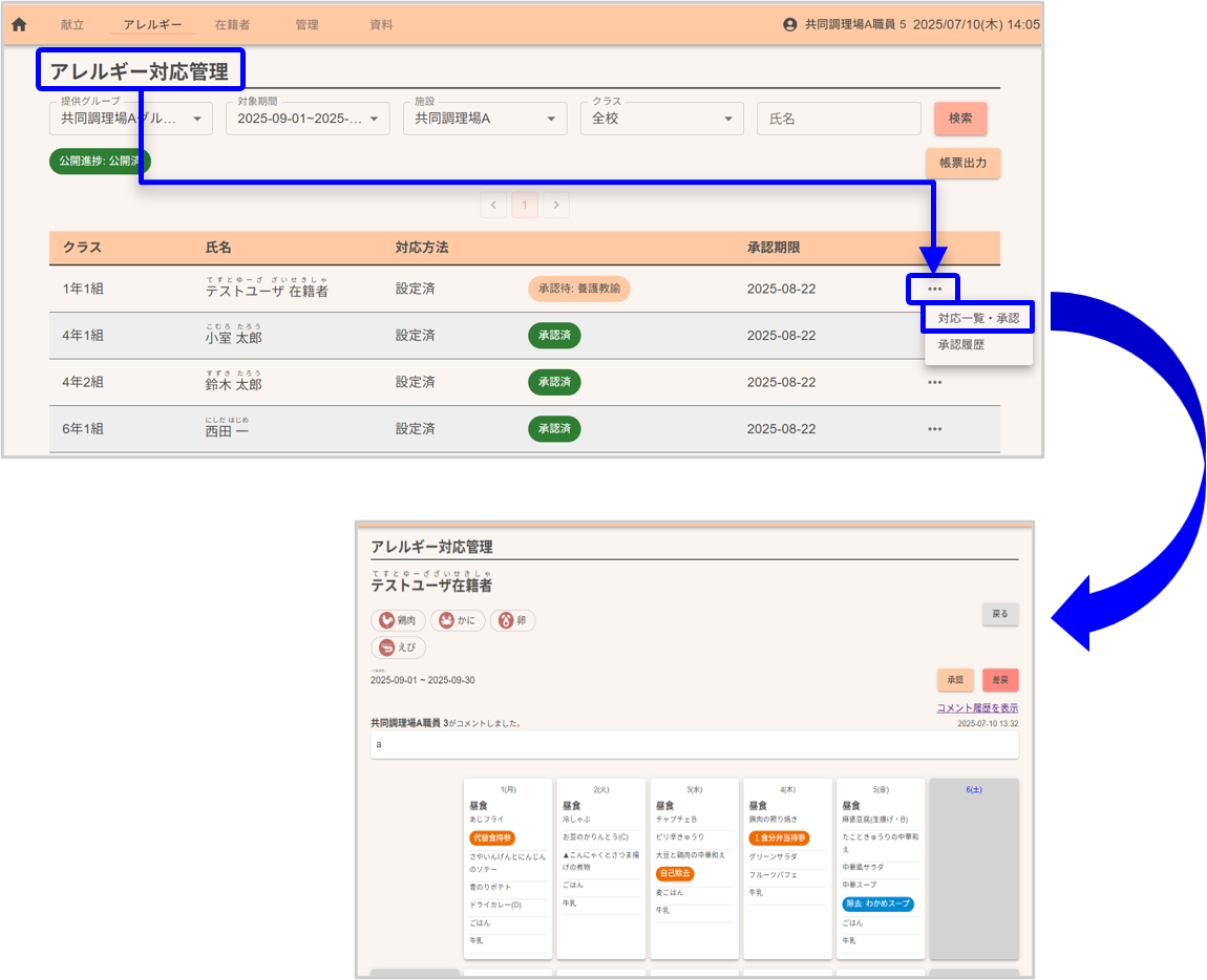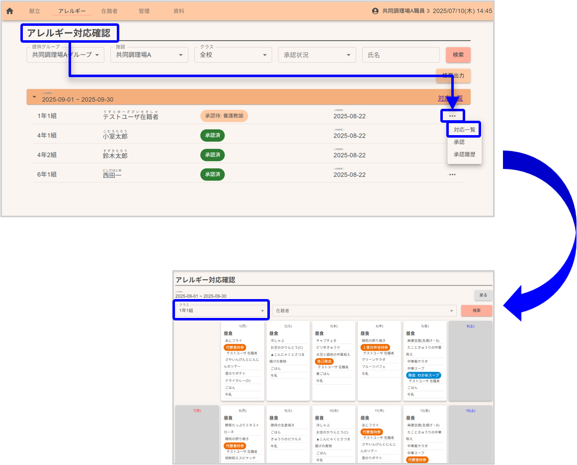 アレルギー対応確認画面で、確認したい在籍者の「・・・」をクリックします。対応一覧画面へ移動し、月ごとの該当クラスの献立と、在籍者のアレルギー対応内容を確認できます。