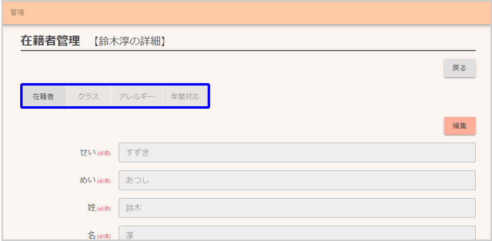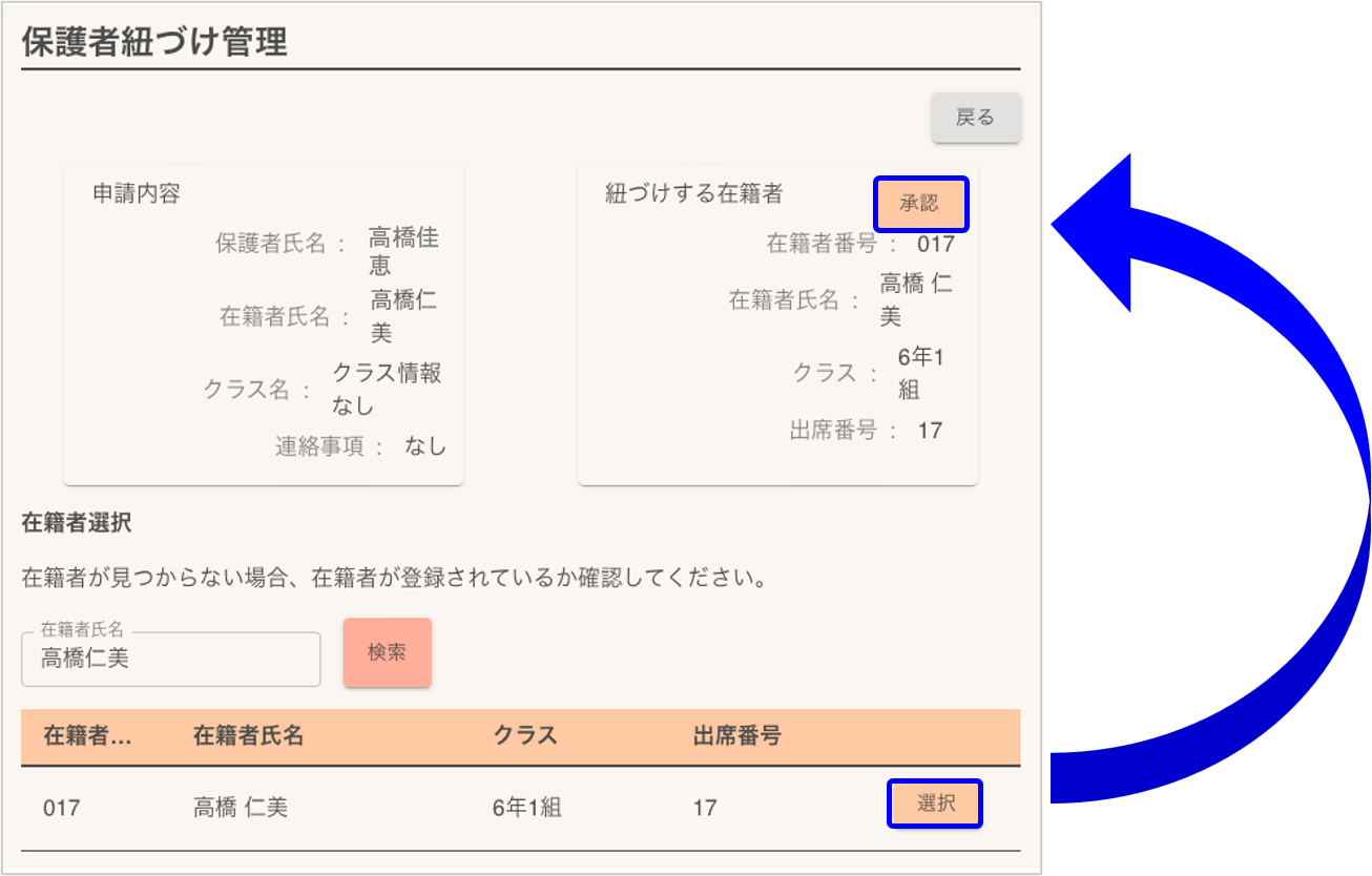 2.保護者紐づけ管理画面で、保護者と在籍者の紐づけを設定することで、保護者は自身の子供の情報を管理することができます。