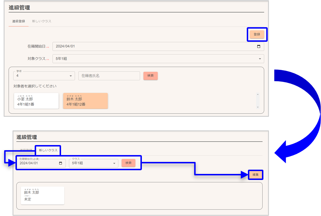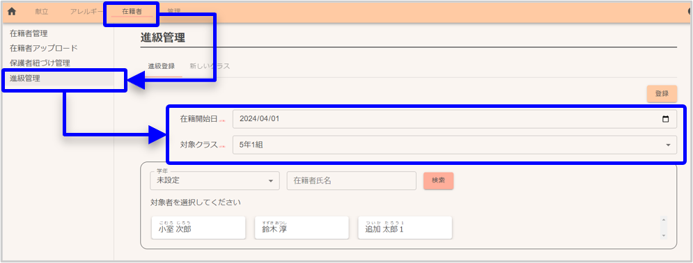3.「登録」をクリックし、在籍者の学年とクラスを変更します。