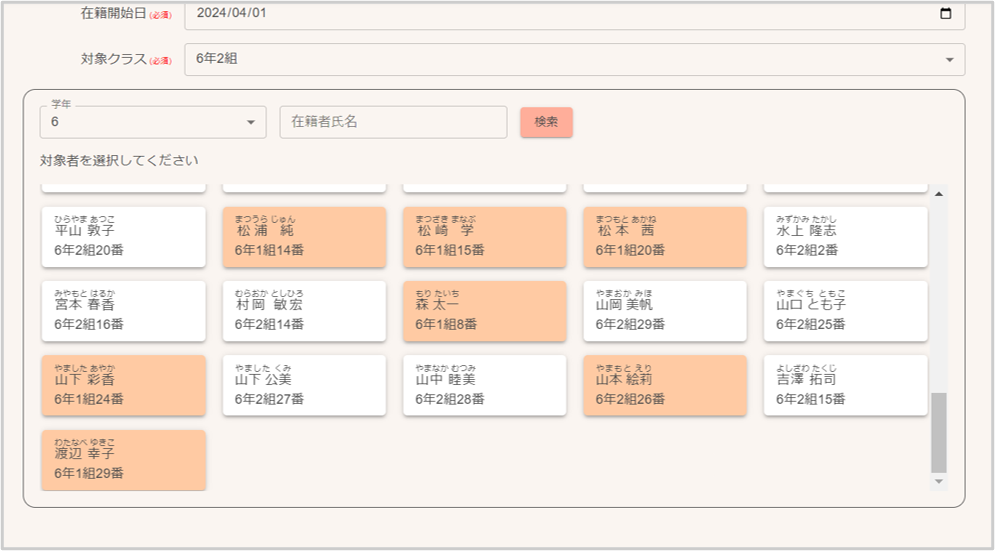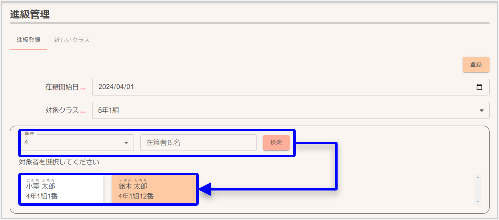 2.検索欄に条件を入力し、進級者を絞り込みます。その後、進級者を選択します。