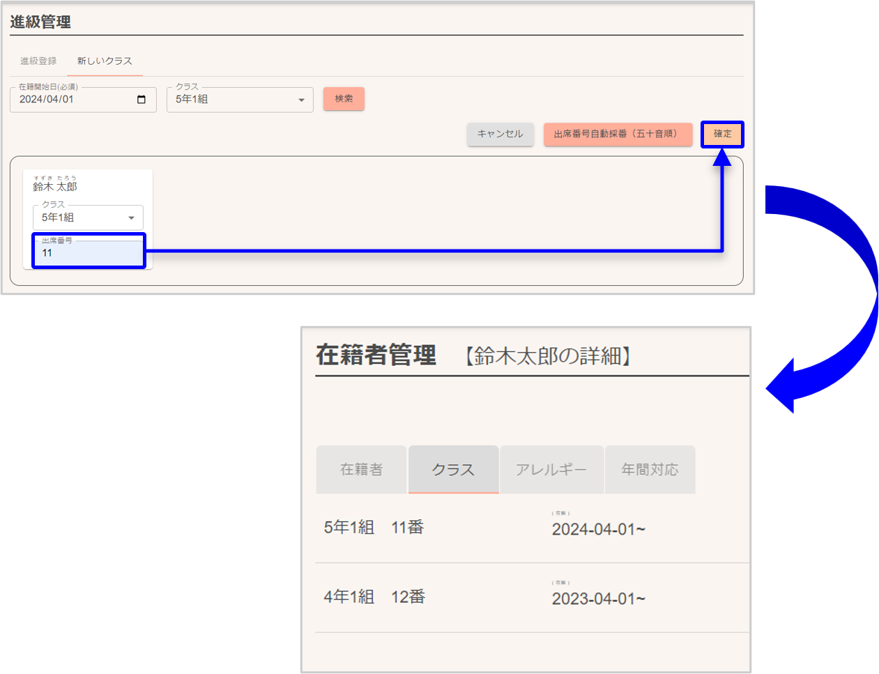 1.進級管理画面で、在籍者の進級先の学年とクラス(対象クラス)、在籍開始日を入力します。