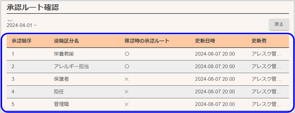 1.献立やアレルギー対応の承認者・承認内容・承認の順番を確認する際には承認ルート確認画面から「・・・」をクリックします。