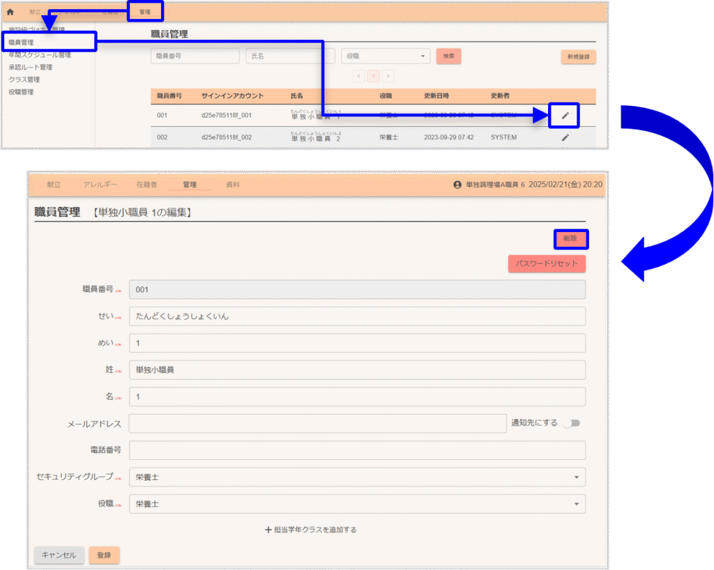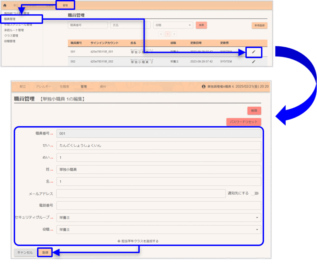 1.職員管理の編集画面で、職員の情報を変更した後、「登録」をクリックします。