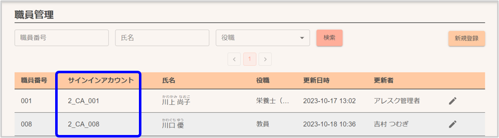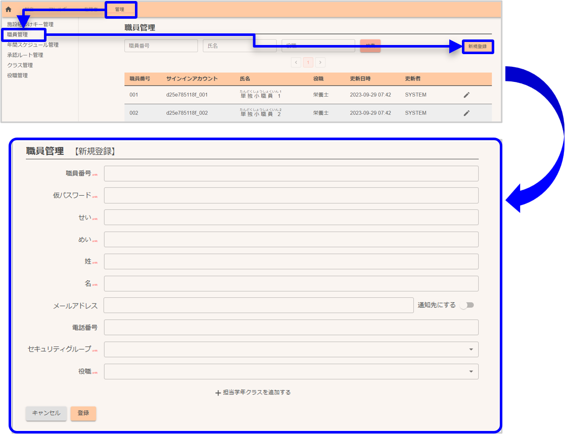 2.職員管理の新規登録画面で 1 の情報を登録します。